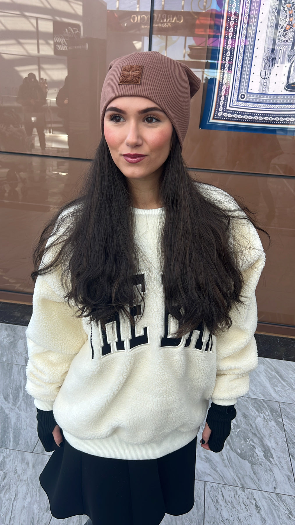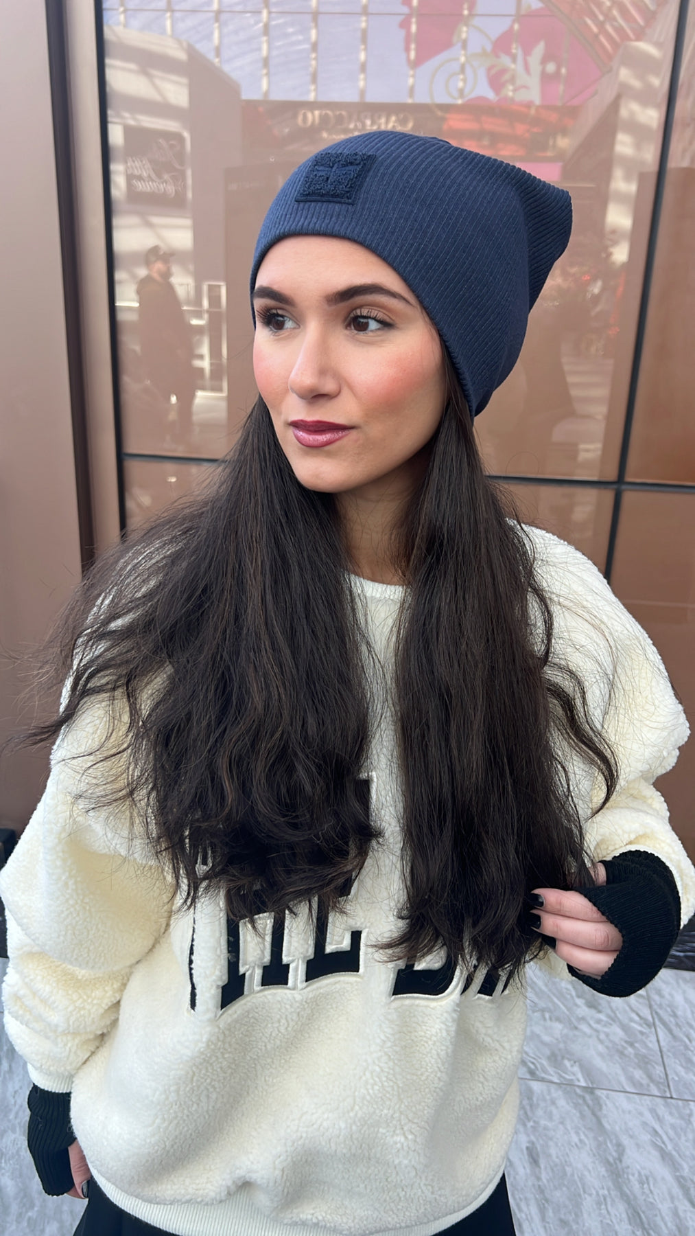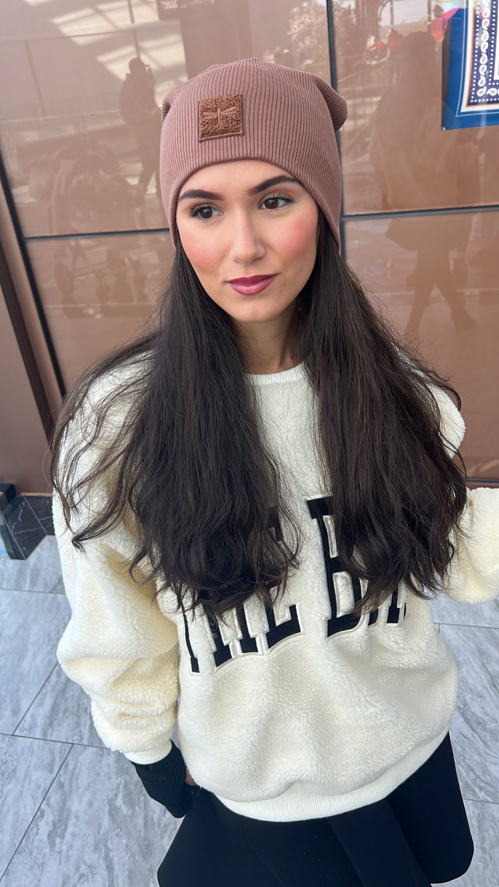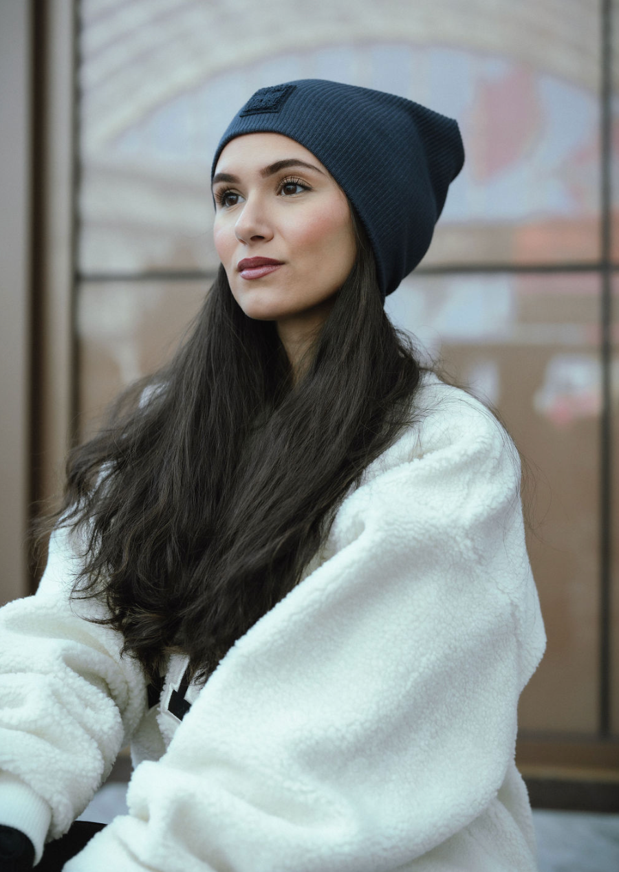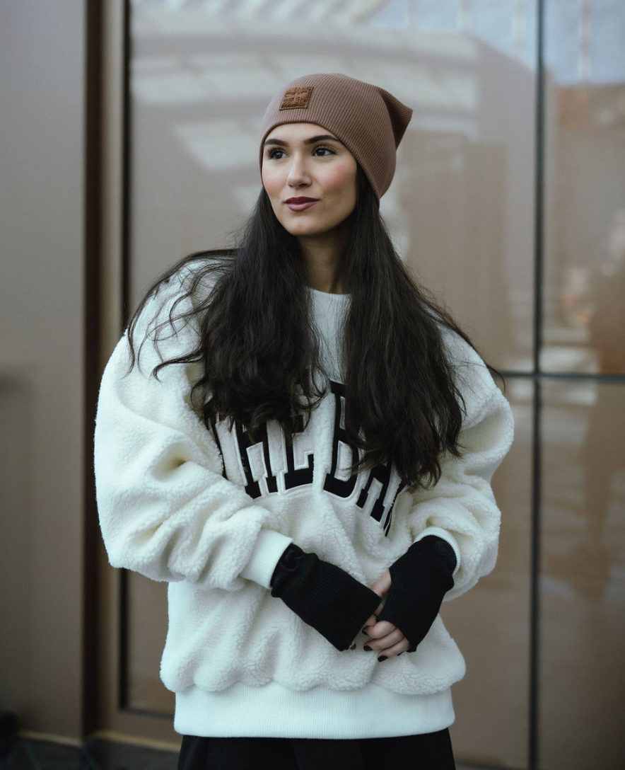 New colors of our bestselling sherpa logo Sweater Beanie, a classic ribbed slouch beanie look. (This is not a cuffed beanie)