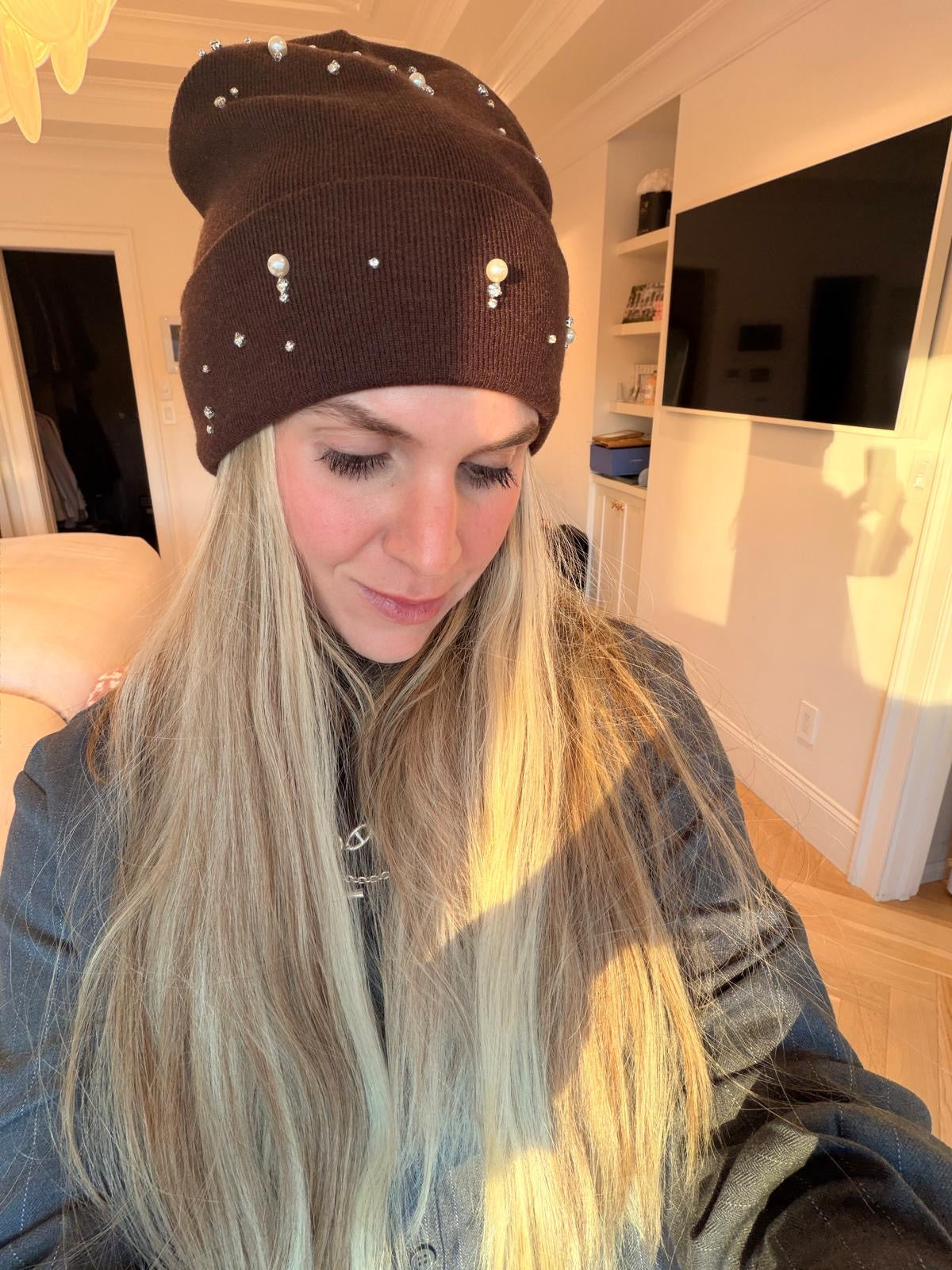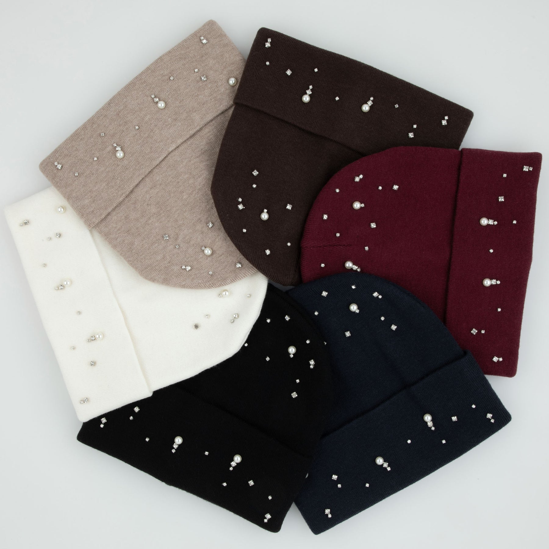 Gorgeous new crystals and pearls arranged on our Cloud Cuff Beanie! Extra soft and delicious, soft cashmere feels.